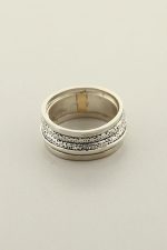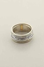 Hand made, two tone band with a multi layered sterling silver bands in various textures and a gold strip across the front.