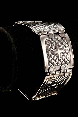 Hand made, wide, sterling silver bracelet with flowers at bloom and a toggle to finish.