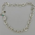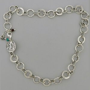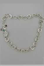 16″ sterling silver long necklace consisted with alternating smooth round circles to dotty round circles with round stamped pendent and two dangling small stones on each side and small extension toped with a small heart.