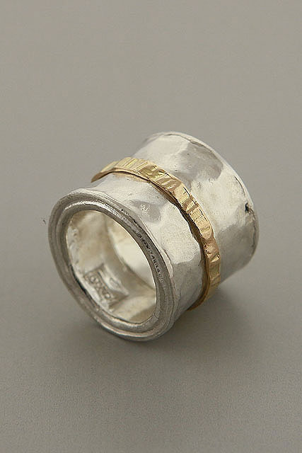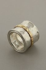An extra wide sterling silver ring with a designed thin gold band on its top center. A two tone jewelry ring is an inspiration for many Israeli designers for many years. This mix offers looks, durability and glam all for a very reasonable price.