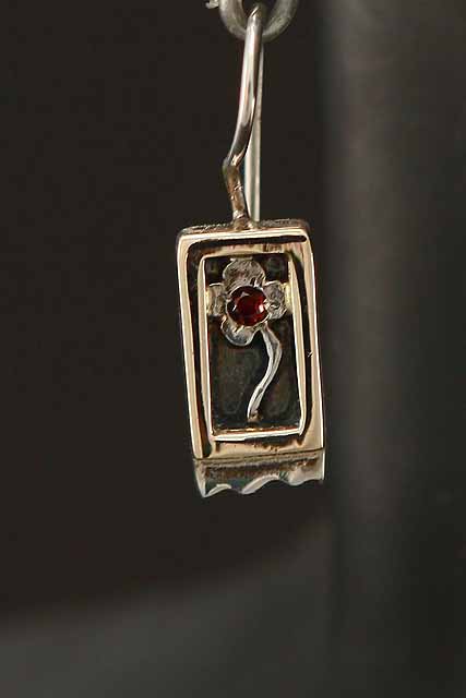 Hand made, flower, sterling silver and gold, hanging earrings with red stones.