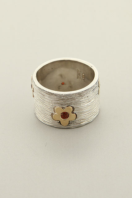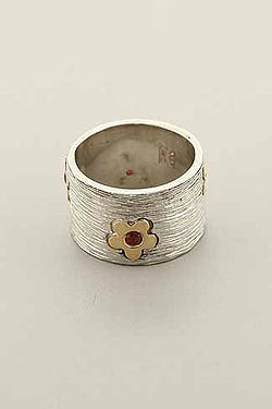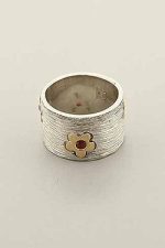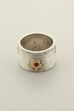 Hand made, two tone, striped band with gold flowers and Garnet stones.