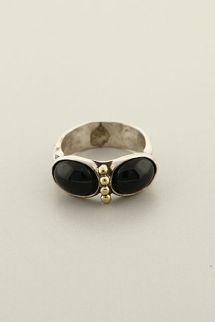 Hand made, two tone, sterling silver and gold band with two Onyx stones.