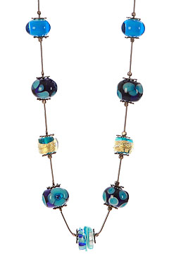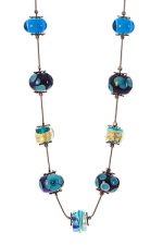 Variety of a blue shads of a nine blue glass, fashion beads necklace on a sterling silver chain.