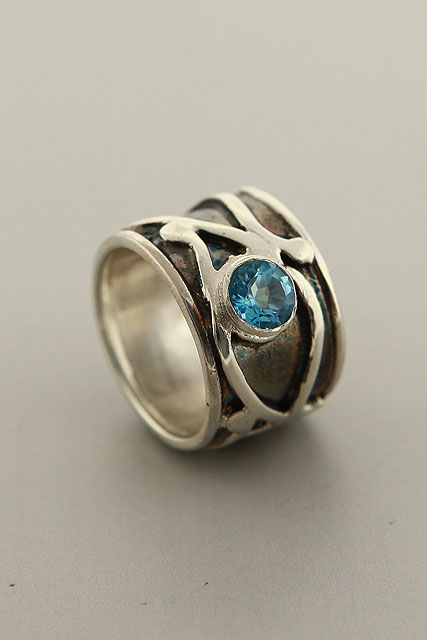 Hand made, sterling silver, wide, shiny with Blue Topaz band.