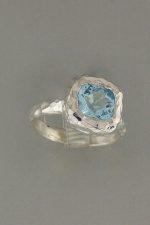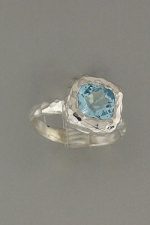 Hand made, hammered, sterling silver round ring with Blue Topaz stone, sets in a solid hammered bay.