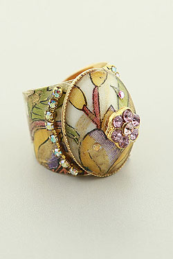 Hand Painted, gold plated metal ring with pastel colors of Pink and White Swarovski Crystals.
