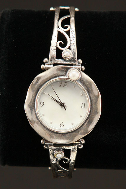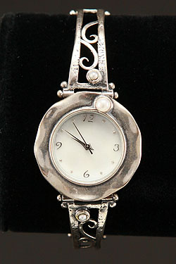 Hand made, sterling silver bracelet watch with a Swiss mechanism, Mother Of Pearl face, pearls and a safety chain.