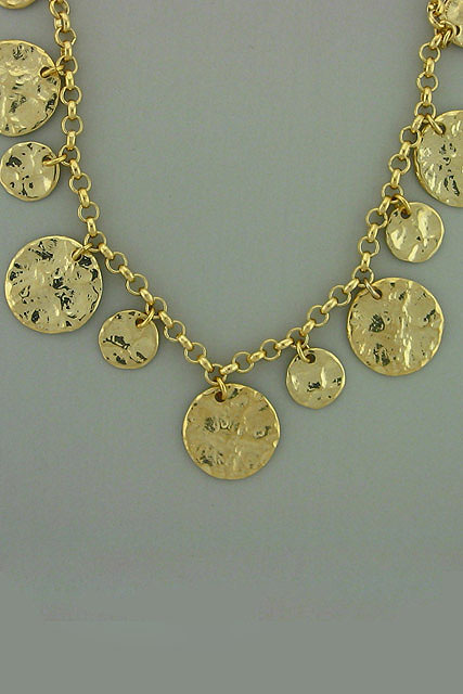 Hand crafted, gold plated necklace with gold plated pendants. One item only. Necklace: 16″ long; 18.5 ” long with extension.