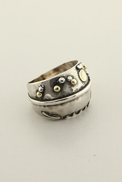 A two tone, contemporary ring in making. This Israeli sculpture artist is a mind master of an incredible and unusual jewelry line that is one of a kind in style and talent. You can find a lot of sterling silver or brass in contemporary jewelry, add gold to it and you get to a whole different ball of jewelry deal.