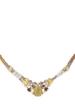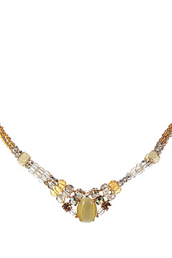 Three layers of gold glass beads, crystal beads and crystals and lemon shads of colored crystal beads.