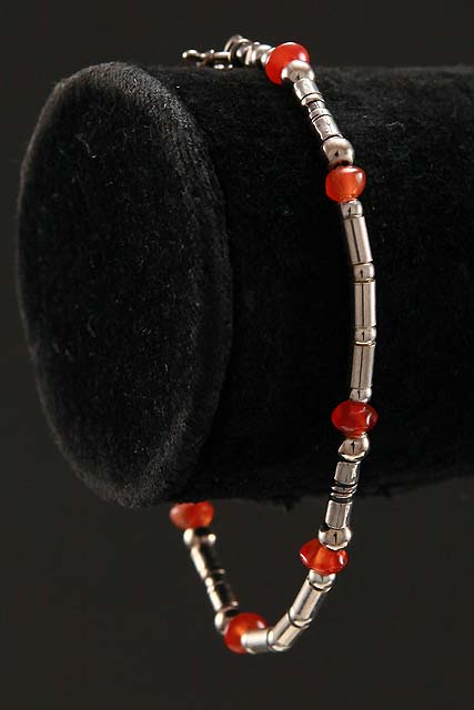 Hand made, sterling silver bracelet with Carnelian stones and small Chamsa charm to a toggle finish.