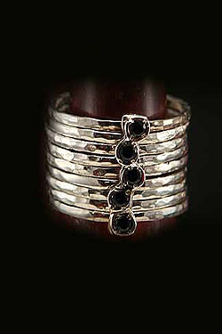 This unique sterling silver band is part of a fashionable and sophisticated, hand made Israeli collection rings. A wide band of a nine sterling silver rings with Blue Sapphire stones sets on top of it adding to the multi rings elegance look .