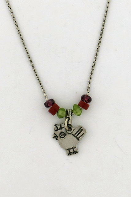 Sterling silver necklace with chicken pendent and semi precious stones to a toggle finish.