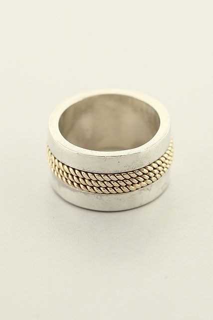Hand made, two tone, wide and thick band with a three gold rings in the center.