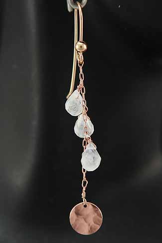 Hand made, rose gold field, hanging Moon drop earrings.