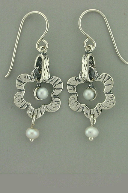 A new flower riff on classic sterling silver earrings. This earrings are edgy with a modern flair and the white pearls are to balance their white snowy pearls look.