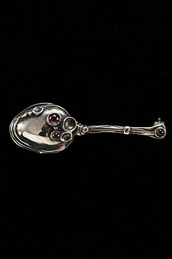 Hand made, sterling silver of sculpture spoon pin with Garnets.