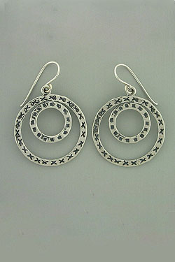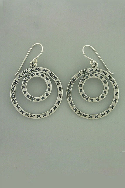 Hand made, sterling silver, double loop earrings with dots and x’s along.