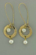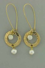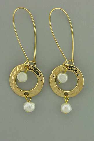 Hand crafted, gold plated long dangling earrings with white pearls. Earrings: 2.2 in. long; 0.75 in. wide.