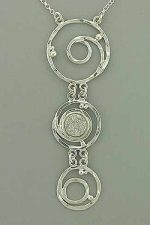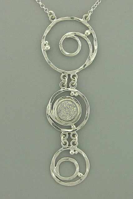Hand made, three tiers, sterling silver necklace uniquely crafted and white Druzy stone that gives this necklace it's glow. One item only. Necklace: 16″ long; 19.5″ long with pendants.