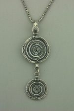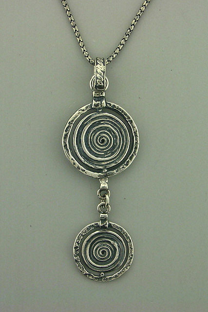 Hand made, oxidized sterling silver pendant with duel spiral. One item only. Chain: 18 in. long; 20.75 in. long with pendent.