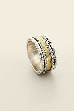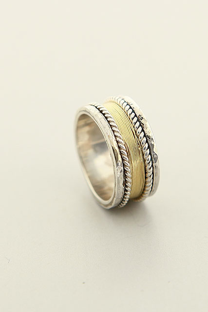 Hand made, two tone with sterling silver band and gold strings looped in center.