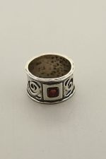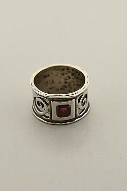 Hand made, sterling silver wide ring with a square Garnet stone in center.