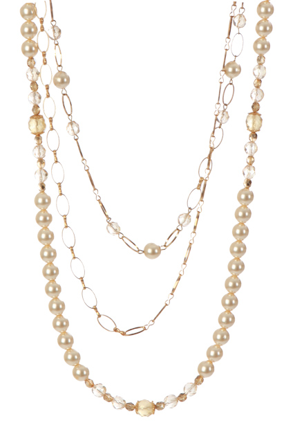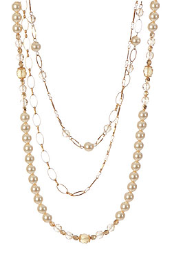 A three tier cultured pearls necklace with gold plated chain and crystals.