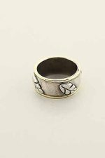 Hand made, two tone band with raised up feathers and gold trim on each side.