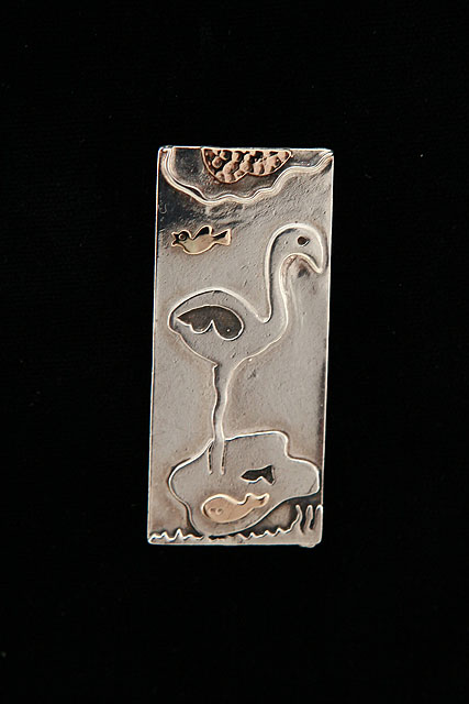 Hand made, sterling silver and gold pin of a Flamingo in a bay.