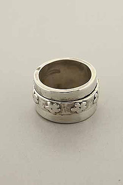 Hand made, sterling silver wide revolving ring with two shiny sides and flower in center,