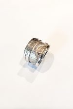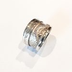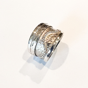 Shiny sterling silver band with a dotty wave and a single revolver ring.