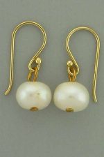Hand crafted of gold plated hanging earrings with white pearls. One item only. Earrings: 0.8″ long.