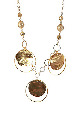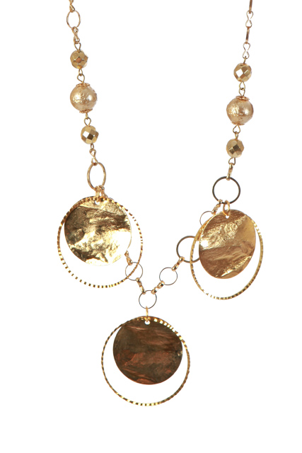 A three round pallets, gold plated fashion necklace with gold plated beads and crystals.