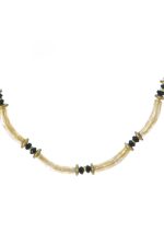 Golden glass beads tubes necklace connected with green pearls, green agates and peridot to a sterling silver chain with a toggle clasp to a finish.