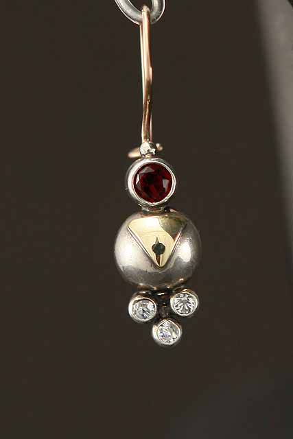 Hand made, sterling silver and gold with a gold wire earrings, Garnet stones and crystals.