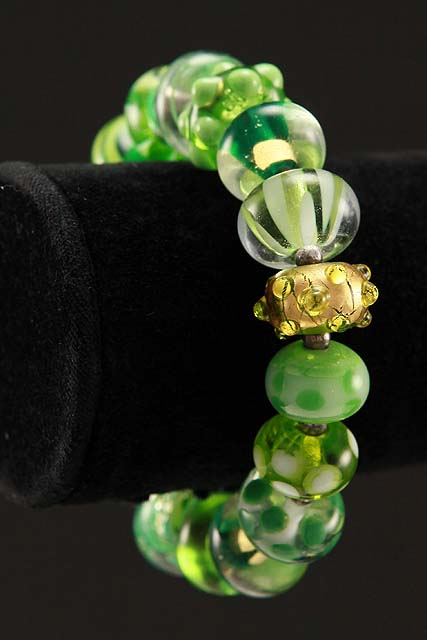 Hand made, Green Glass blown beads on an elastic bracelet with golden tones and sterling silver beads in between. One peace of a kind.