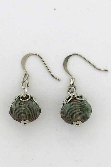 Sterling silver, small beaded earrings with grey fabric on top and sterling silver wires.