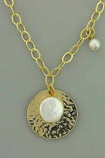 Hand crafted, gold plated necklace with a fresh water pearl in front and one on the right side. One item only. Chain: 16″ long and 17″ long with pendent.
