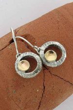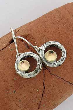 Two tone earrings with a silver striped small circle and 14k gold dimpled in its center on silver wires.