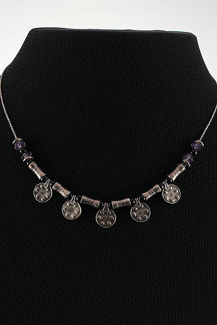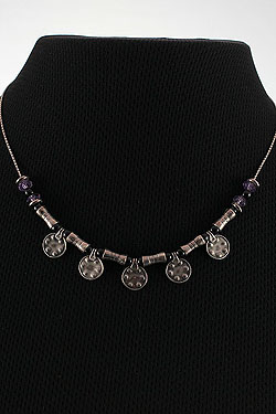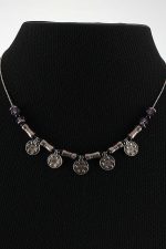 Get unique beaded necklace-confident with this Israeli jewelry secret. Created by one of the Israeli jewelry designer of her time. This sterling silver has dimples and curves in such artistic way with colors of Onyx and Amethyst stones to shine.