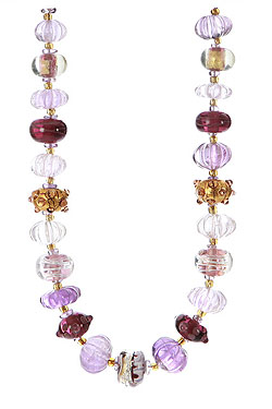 Hand blown, one of a kind glass beads necklace in pink, lavender, fuchsia and gold colors with sterling silver chain to a toggle finish.