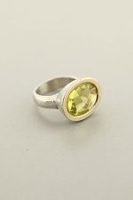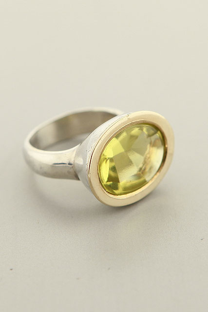 Hand made, two tone, shiny, sterling silver ring with Lemon Jade stone, toped with a gold frame.
