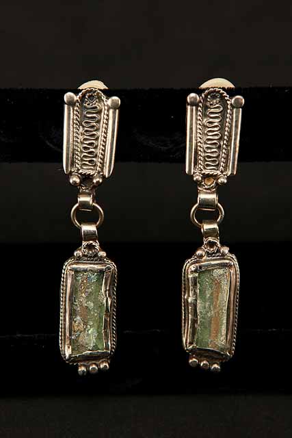 Statements makes entrance and social conversation when you wear this unique clip on sterling silver and Roman Glass earrings. The patina in the glass gives it its unique look and people are drawn to it. The ethnic designs around it adds to its spectacular one of a kind look.