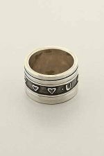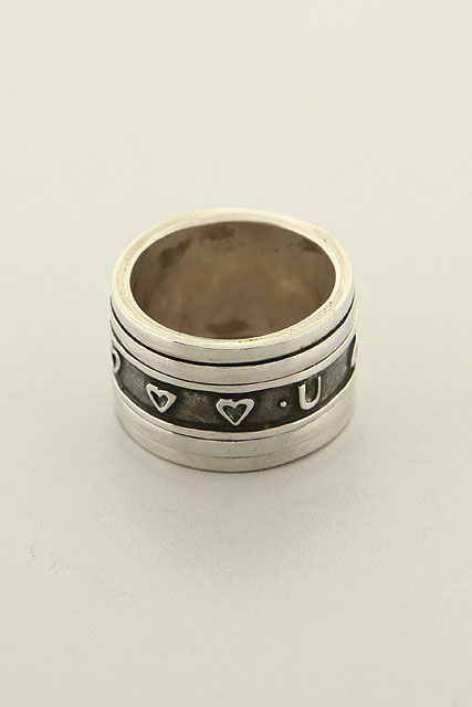Total texture embroidered with raised letters and hearts shapes to create textural patterns. This handmade wide and revolving band is a 100% of sterling silver with oxidation in between for coloring accent .
