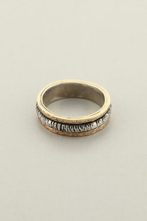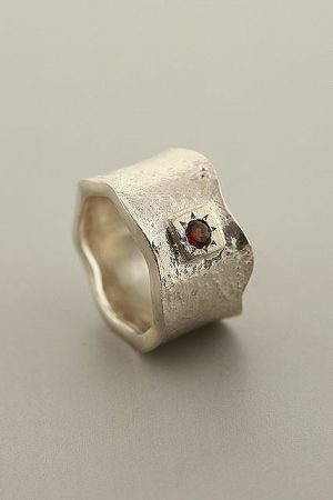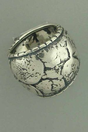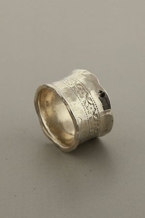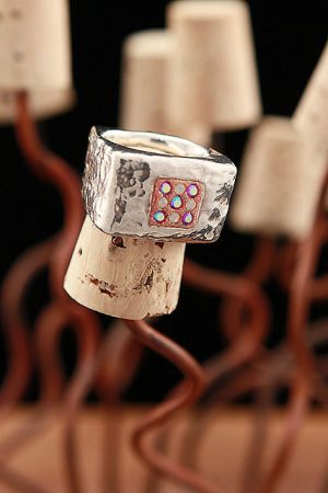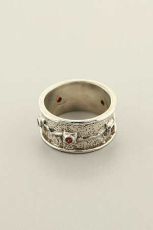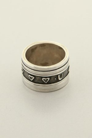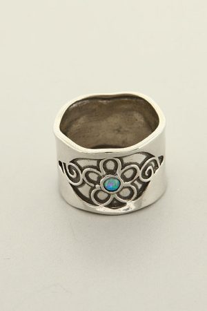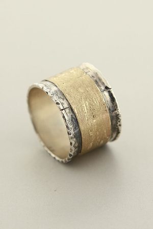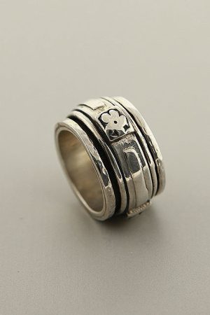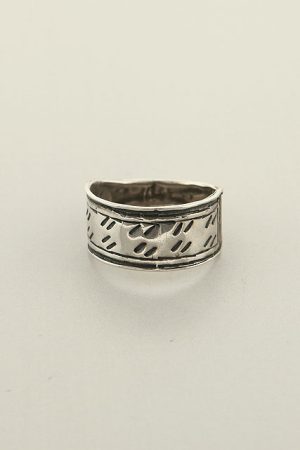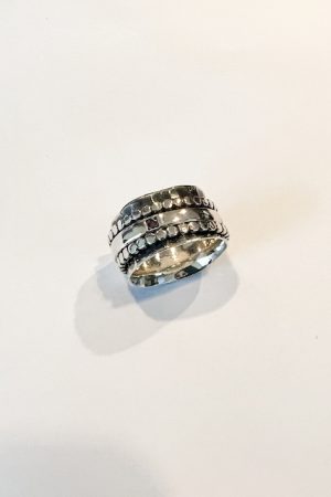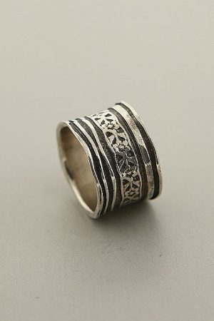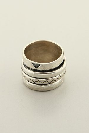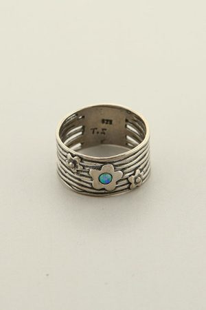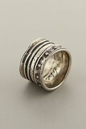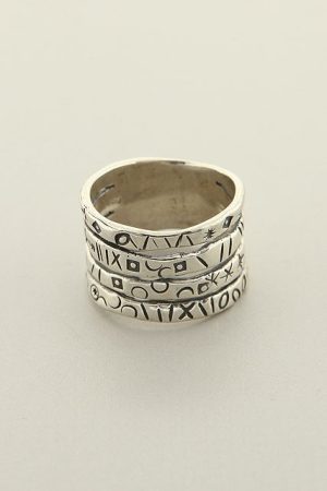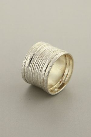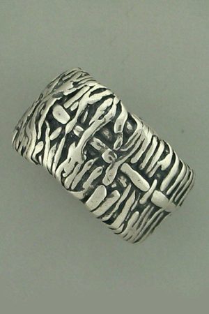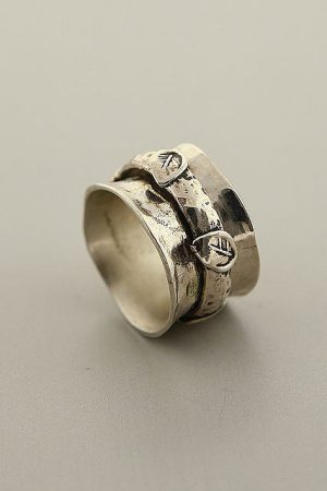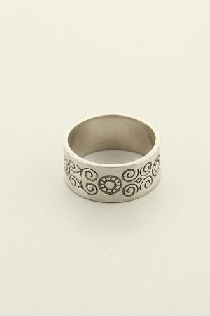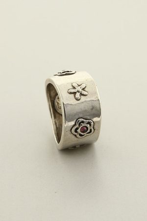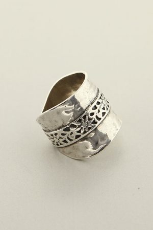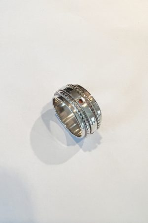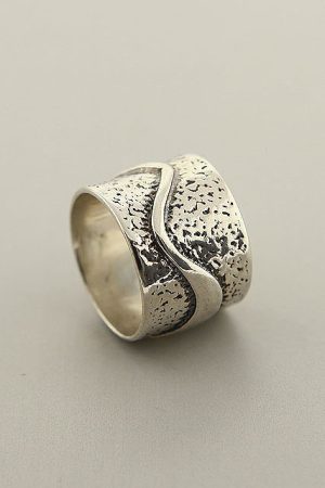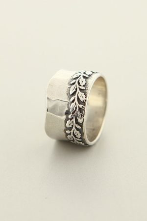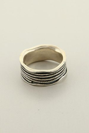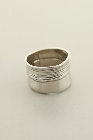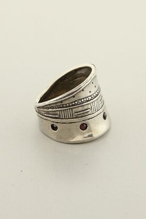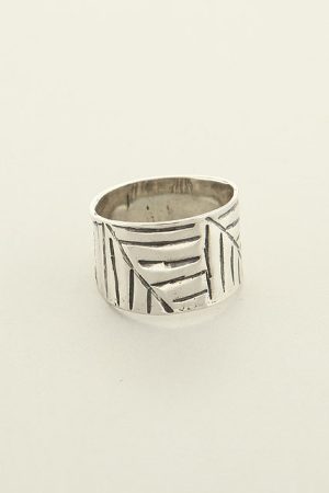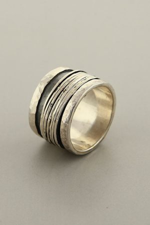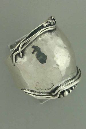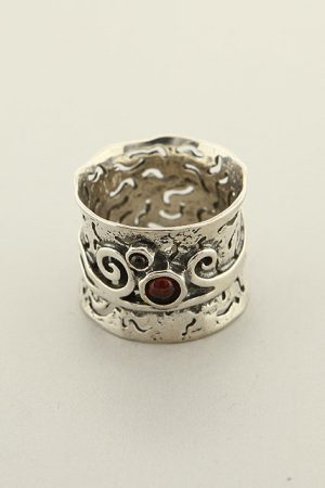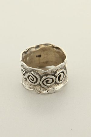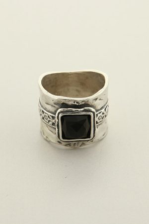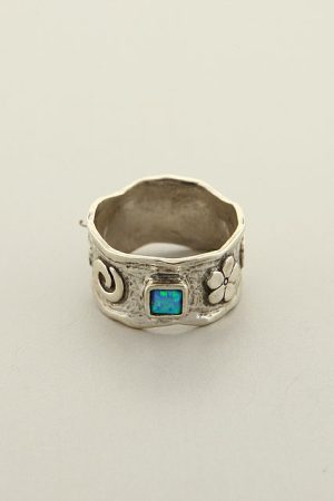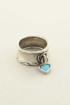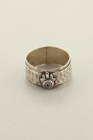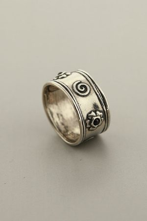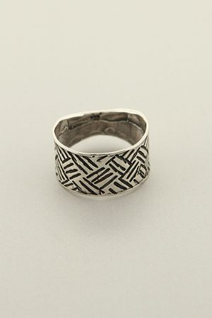 Artful to Artisanal – Embossed sterling silver band with sterling silver lines on a wide sterling silver band with a smooth artisan heart and a C.Z. sparkle. An original artwork by our designers into Israeli luxe accents that is authentic the Israeli way.