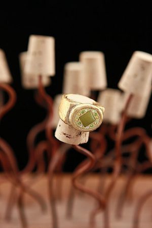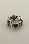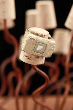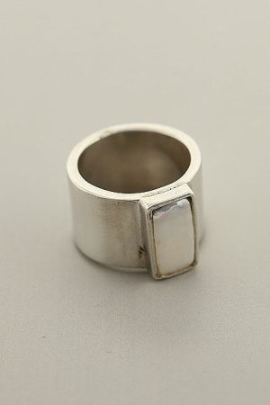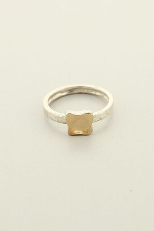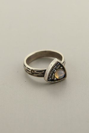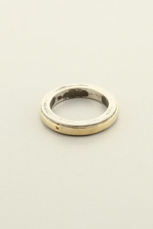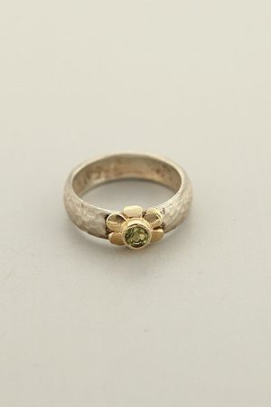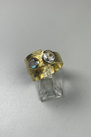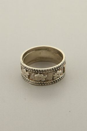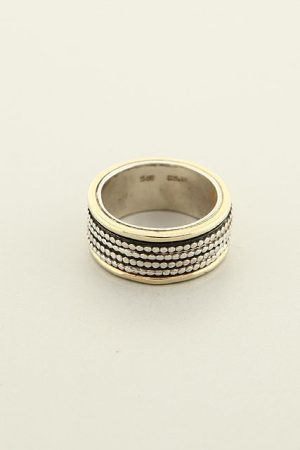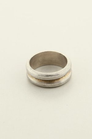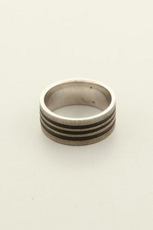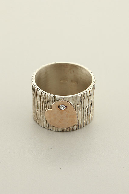 Hand made, wide, striped, sterling silver band with a gold heart shape and a clear crystal stone.