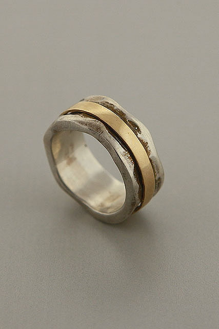 Hand made, two tone band with shiny, wavy, sterling silver band in a smooth center gold band. Band: 0.3 in. wide.