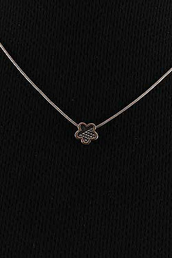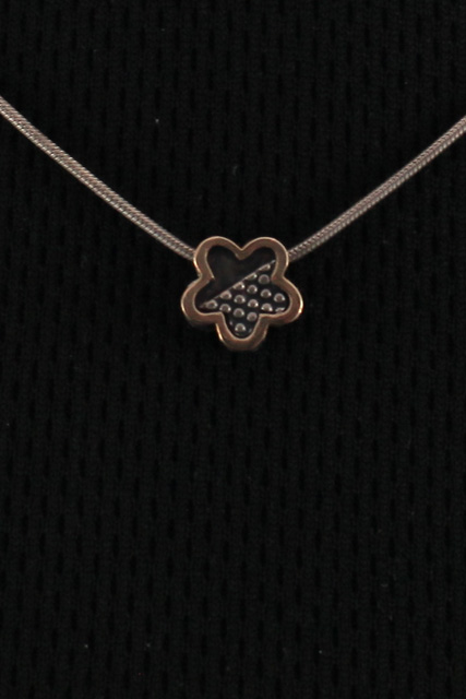 Modern thinking inspired by two tone flower necklace on a sleek silver chain. Clean gold of flower line and a split sterling silver that is a half oxidized an d half shiny dotty silver. A flower that slides on the chain in a modern space.